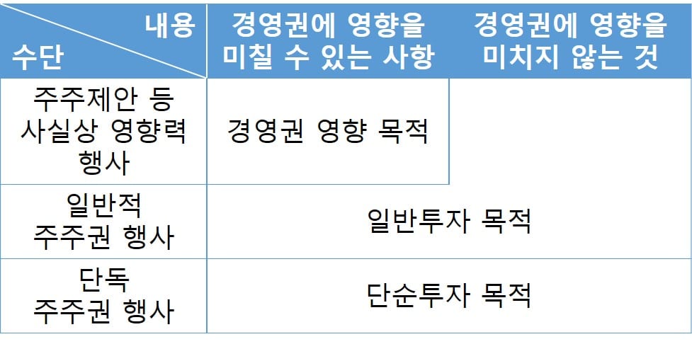 다만, 주식취득으로 지배주주가 되거나, 이사를 선임할 정도의 지분을 취득하는 경우 등은 지분비율에 따른 의결권을 행사하는 것 자체가 경영권에 영향을 주기 때문에 경영권 영향 목적의 주식취득으로 보아야 할 것으로 보인다.